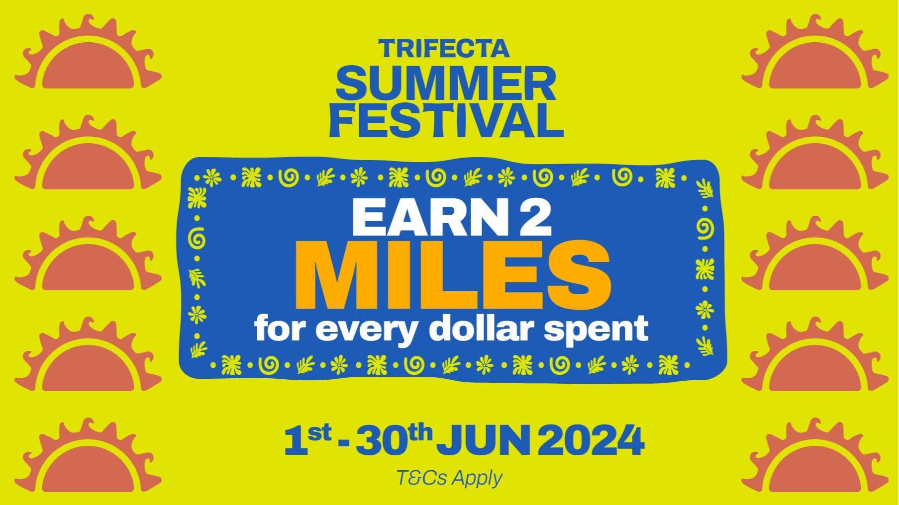 From 1 - 30 June 2024, earn 2 miles for every dollar spent when you purchase a TRIFECTA 100 credit pack, 300 credit pack, season pass or spend more than $200 in a single receipt in-store at The Ride Side at TRIFECTA!